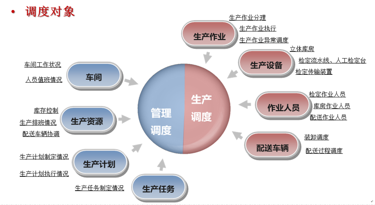 第一时间应用生产分析引擎,制定科研合理生产周计划,其次统筹派工班次管理、巡检管理生产任务,同时生成生产作业,然后顺利获得调度控制台协调调度作业处理、作业调度、异常处理、电子看板、组态监控等生产过程,从而支撑检定流水线和人工检定工作的多业务模式